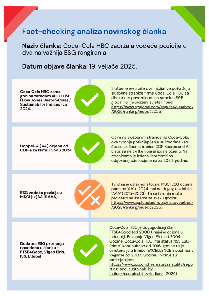 Članak izvještava o najnovijim rezultatima Coca Cola HBC u području održivosti, ističući kako je kompanija osmu godinu zaredom zauzela vodeće mjesto u Dow Jones Sustainability Indeksu (DJSI) među proizvođačima pića te ponovno dobila dvostruku ocjenu “A” za svoj rad na klimatskim promjenama i upravljanju vodama. Osim toga, navodi se kako Coca Cola HBC kontinuirano zadržava visoke ocjene i prepoznatljivost u drugim važnim ESG rangiranjima, poput MSCI ESG, FTSE4Good, ISS ESG i Vigeo Eiris. U članku se također naglašava strateški fokus kompanije na održivost, kao i uloga ESG kriterija u jačanju dugoročne vrijednosti i povjerenja dionika povezanih s poduzećem.